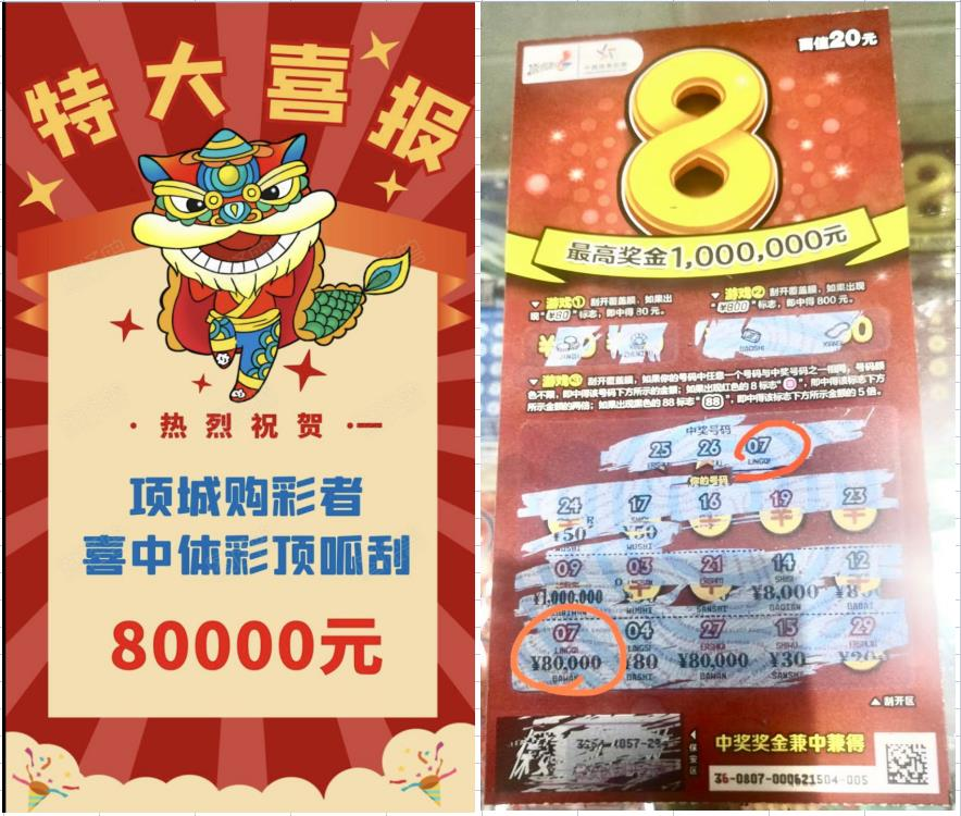 日前,張先生路過項(xiàng)城4116810161體彩實(shí)體店時(shí)挑選了幾張面值10元的“超值8”。沒想到其中一張竟刮出了8萬(wàn)元大獎(jiǎng)。