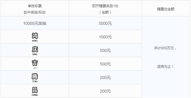 活動期間,購彩者在我省任一體彩銷售實體店購買指定活動票種,若單張彩票刮中符合獎勵條件的獎級或標志,經(jīng)實體店終端兌獎設(shè)備成功完成獎金兌付(如中獎)及促銷兌獎掃描后,即可獲得即開票贈票獎品一份。總額有限,送完為止,詳見下表: