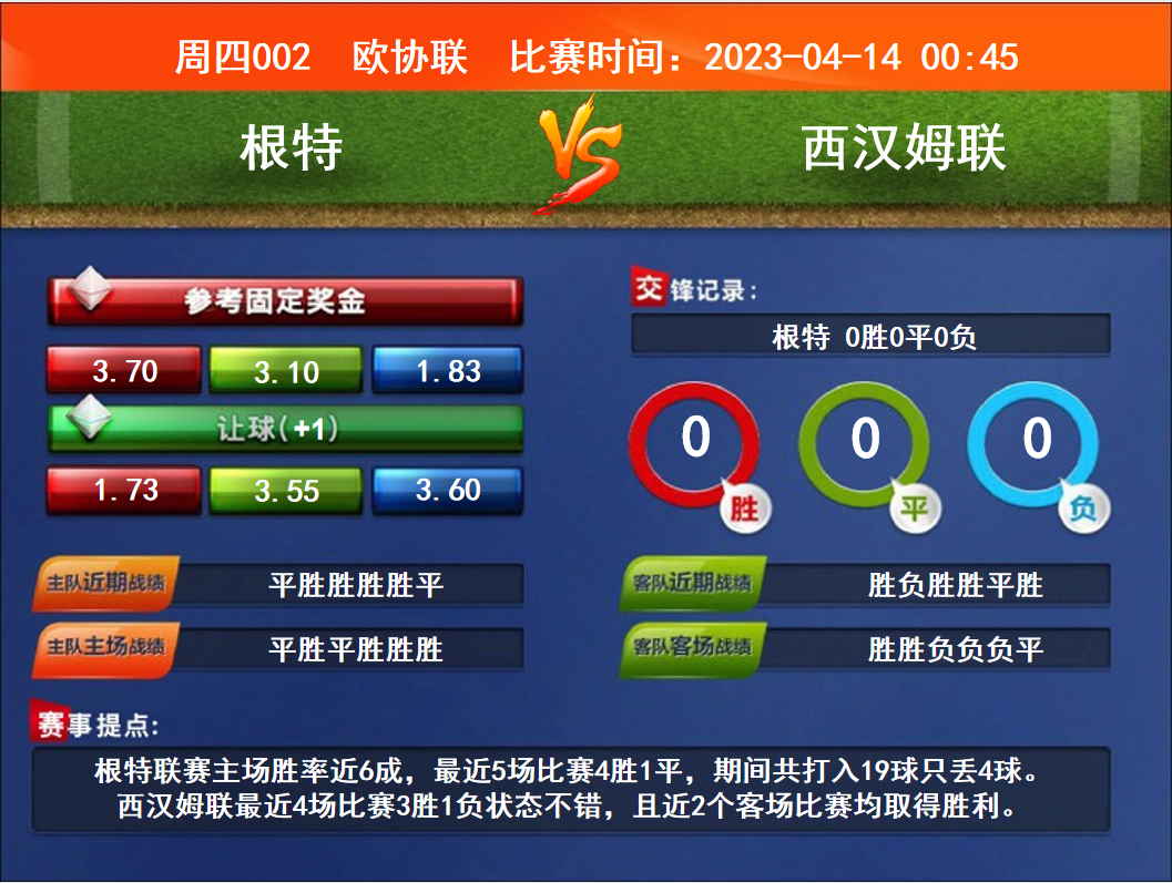 比賽時間:2023-04-14 00:45賽事提點:根特聯(lián)賽主場勝率近6成,最近5場比賽4勝1平,期間共打入19球只丟4球。西漢姆聯(lián)最近4場比賽3勝1負狀態(tài)不錯,且近2個客場比賽均取得勝利。