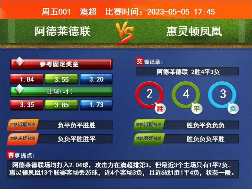 比賽時間:2023-05-05 17:45賽事提點:阿德萊德聯(lián)場均打入2.04球,攻擊力在澳超排第3,但最近3個主場只有1平2負。惠靈頓鳳凰13個聯(lián)賽客場丟25球,近4個客場3負,且近6戰(zhàn)1勝1平4負,狀態(tài)一般。