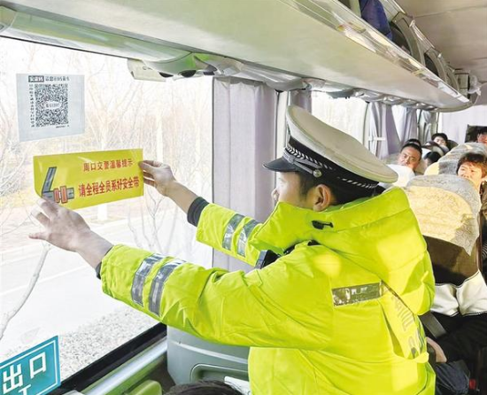 2月2日,周口交警為客車貼上溫馨提示條。2026年春運(yùn)大幕正式拉開,為期40天的春運(yùn)安保工作同步全面啟動。